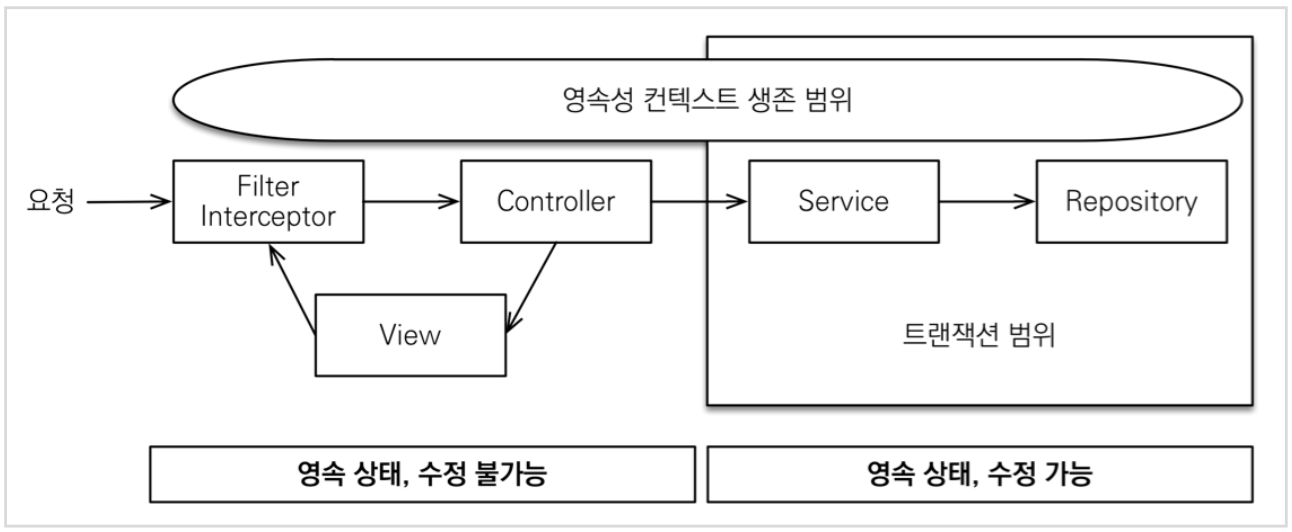 - 요청이 들어오자마자 서블릿 필터나 스프링 인터셉터에서 영속성 컨텍스트를 만들면서 트랜잭션을 시작하고 요청이 끝날 때 트랜잭션과 영속성 컨텍스트를 함께 종료한다. 이렇게 하면 영속성 컨텍스트가 처음부터 끝까지 살아있으므로 조회한 엔티티도 영속 상태를 유지한다.