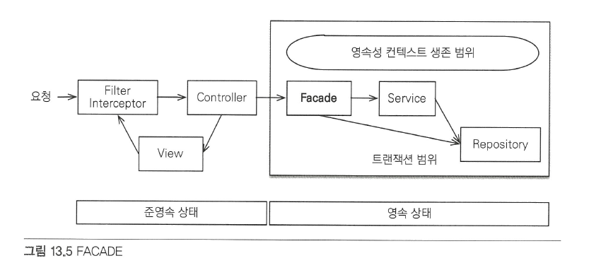 - 프리젠테이션 계층과 서비스 계층 사이에 FACADE 계층을 하나 더 두는 방법이다. 이제부터 뷰를 위한 프록시 초기화는 이곳에서 담당한다. 덕분에 서비스 계층은 프리젠테이션 계층을 위해 프록시를 초기화 하지 않아도 된다. 결과적으로 FACADE 계층을 도입해서 서비스 계층과 프리젠테이션 계층 사이에 논리적인 의존성을 분리할 수 있다.