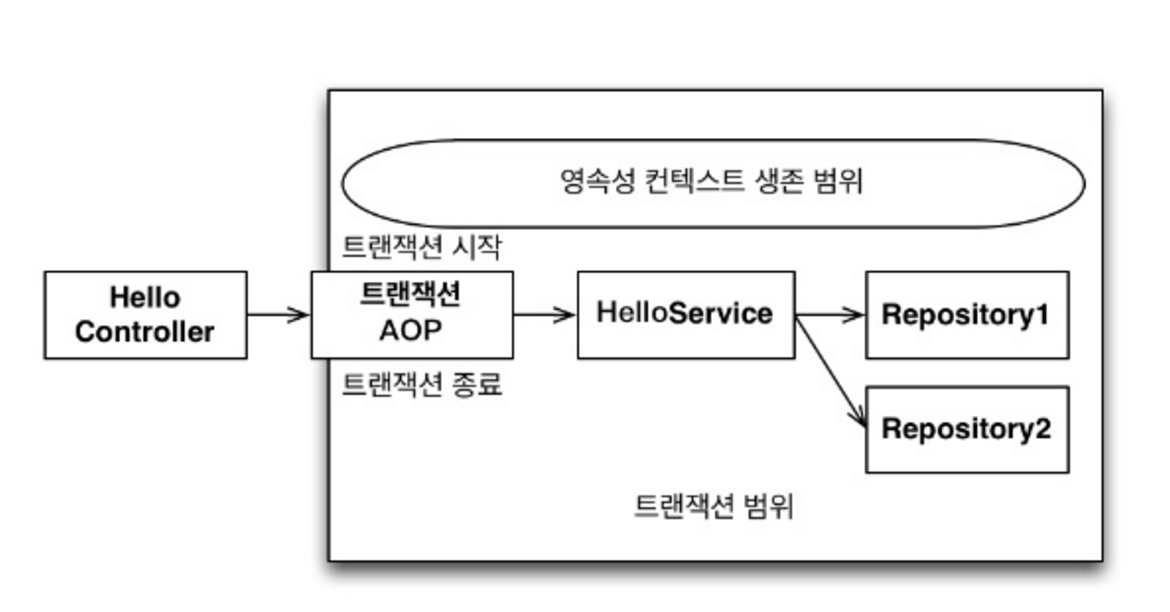 - 스프링 컨테이너는 트랜잭션 범위의 영속성 컨텍스트 전략을 기본으로 사용한다. 이 전략은 이름 그대로 트랜잭션의 범위와 영속성 컨텍스트의 생존 범위가 같다는 뜻이다. 이 전략은 트랜잭션을 시작할 때 영속성 컨텍스트를 생성하고 트랜잭션이 끝날 때 영속성 컨텍스트를 종료한다. 그리고 같은 트랜잭션 안에서는 항상 같은 영속성 컨텍스트에 접근한다.