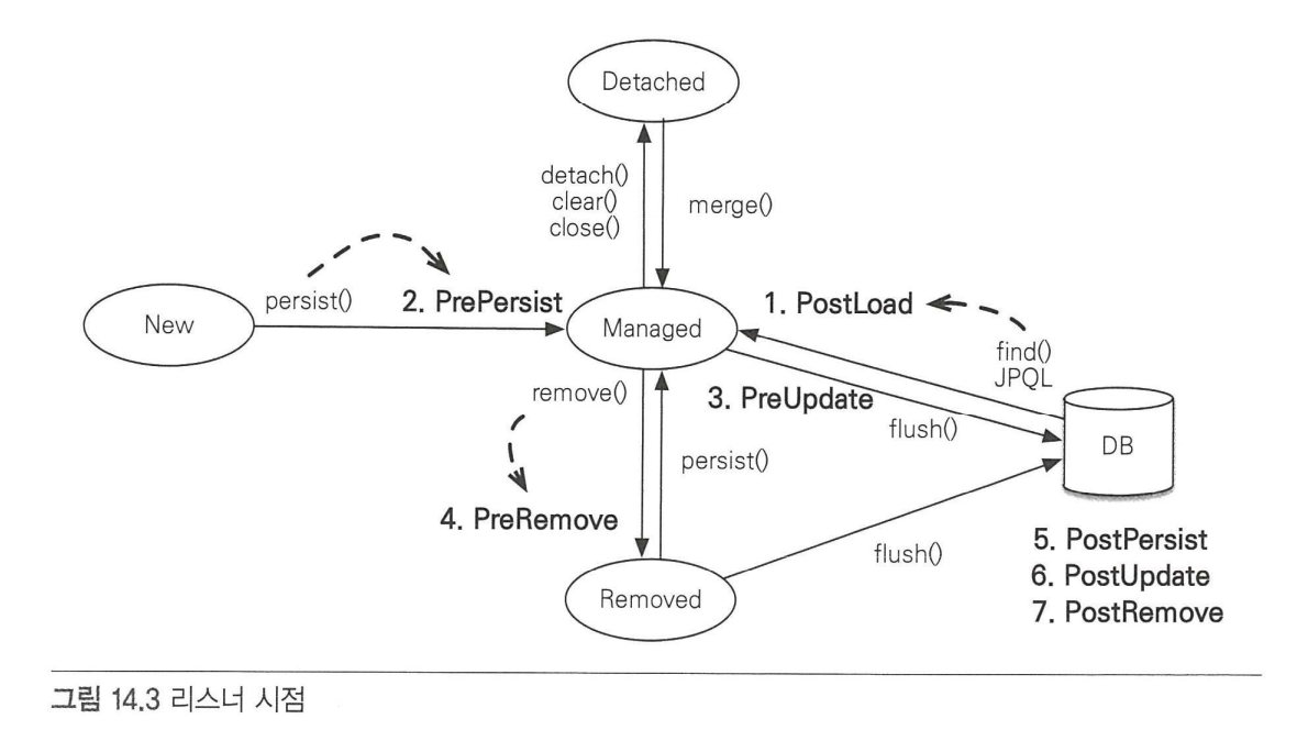 - JPA 리스너 기능을 사용하면 엔티티의 생명주기에 따른 이벤트를 처리할 수 있다.